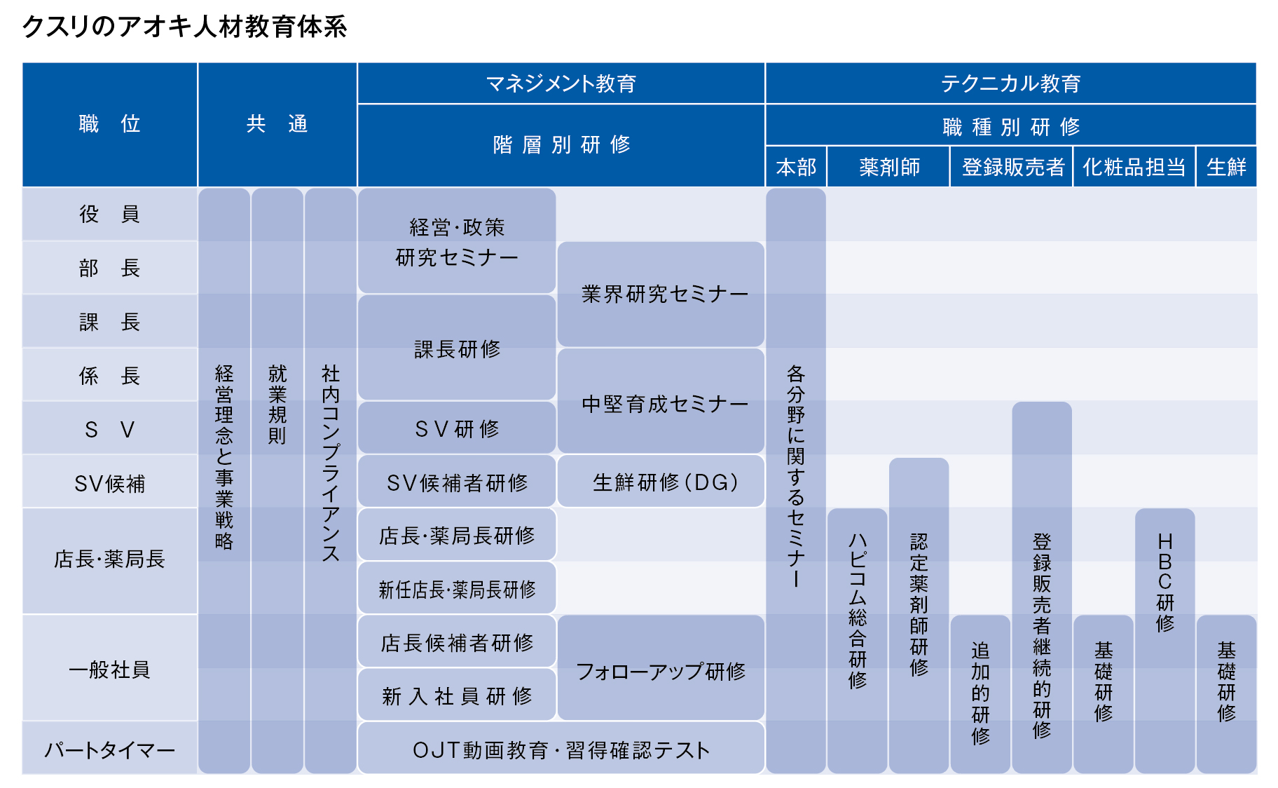 おります。新入社員研修・フォローアップ研修、そして店長・薬局長研修から課長研修等、新入社員から将来の幹部候