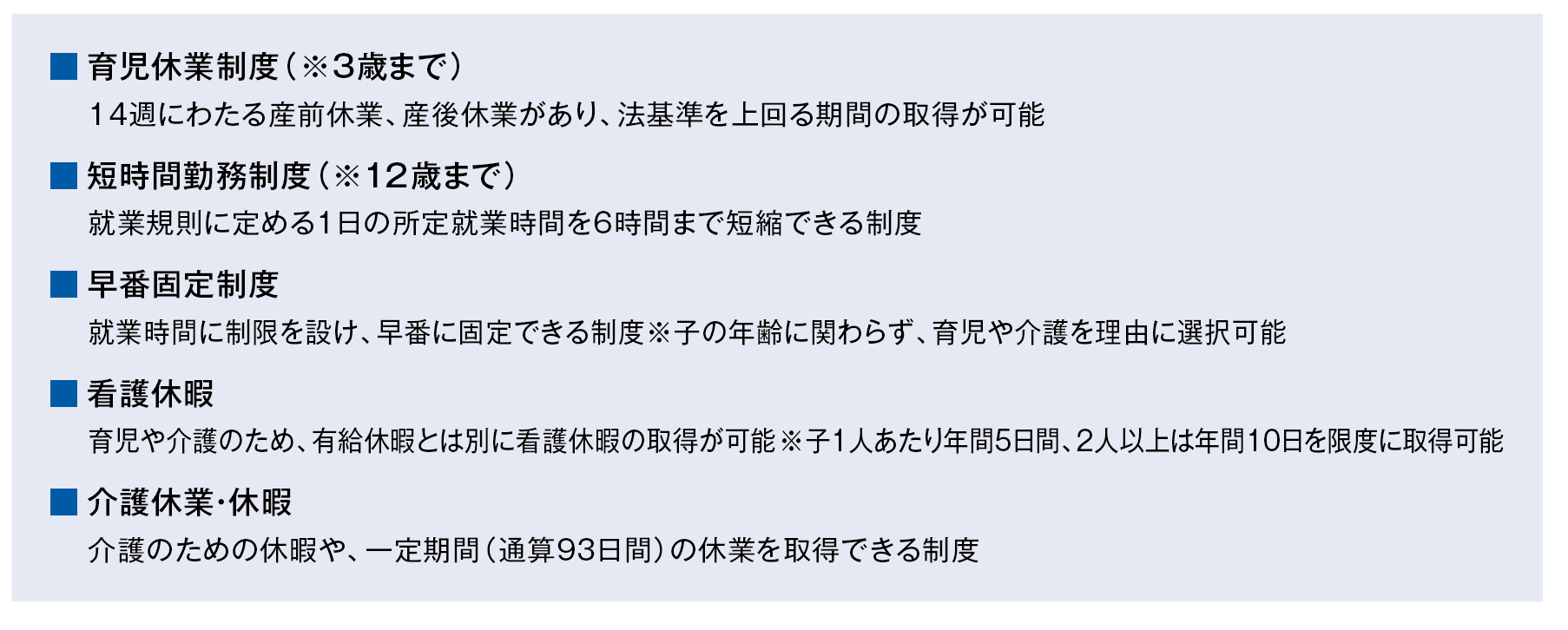 育児・介護に関する様々な支援体制を整備し、子育てや介護と仕事を両立しやすい環境づくりに努めています。